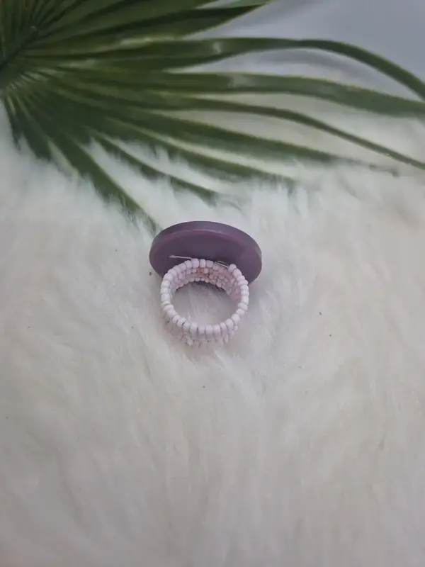 Corps de bague tissé en petites perles de rocailles pastel et assemblage de boutons superposés (violet, bordeaux, rose) pour un style pop et ludique.