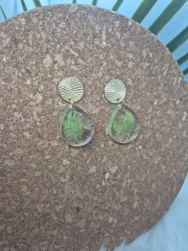 Design : Une goutte transparente laissant apparaître les détails vibrants et les reflets verts de la plume, surmontée d'un clou d'oreille doré texturé au fini "soleil".