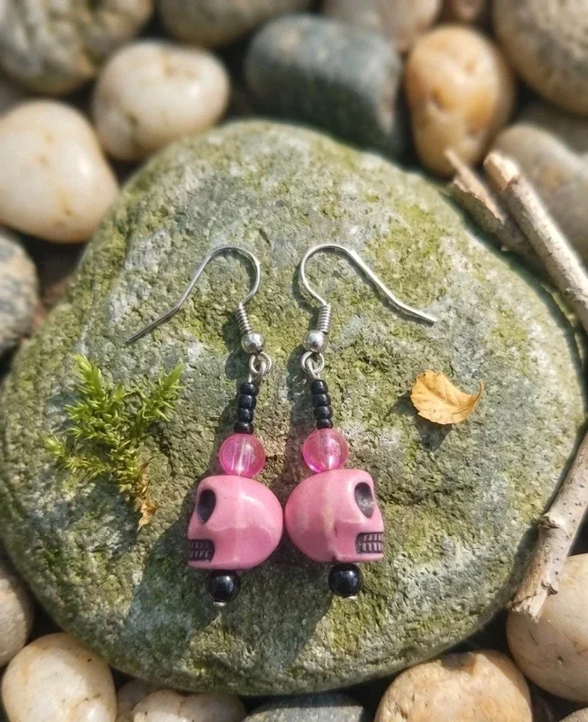 Osez le contraste ! Ces boucles d'oreilles fantaisie assemblées à la main marient le style gothique-rock d'une tête de mort et le peps d'un rose vif.