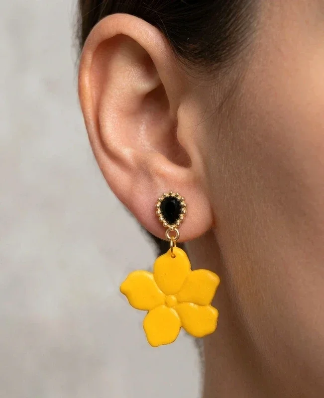 Création : Fleurs jaunes modelées à la main en pâte polymère, avec une finition brillante.