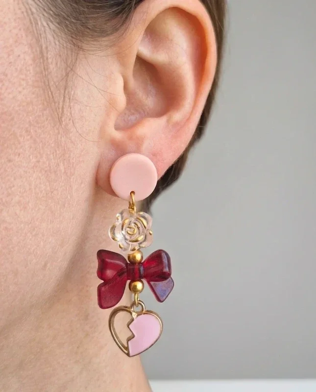 Une structure en superposition avec une puce d'oreille rose, une rose transparente ciselée, un nœud en résine rouge bordeaux profond et deux petites perles dorées.